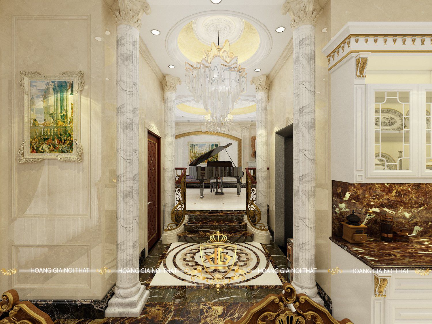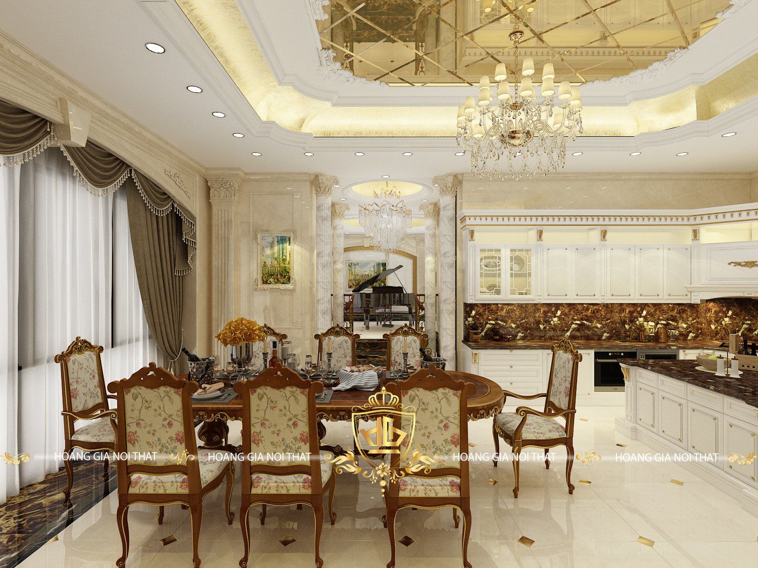 Các họa tiết hoa văn chạm khắc trên nội thất gỗ óc chó mang đậm phong cách tân cổ điển. Từng chi tiết đều được các nghệ nhân tỉ mỉ tạo tác, thể hiện sự kỳ công và tinh tế. Sự kết hợp hài hòa giữa ánh sáng từ đèn chùm pha lê và màu sắc nội thất gỗ óc chó đã biến phòng khách thành một không gian xa hoa, ấn tượng.