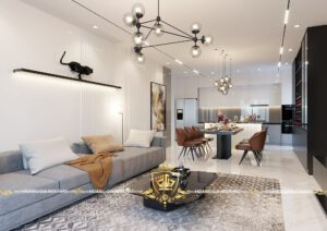 Khám phá lý do nội thất phòng khách kết hợp phòng bếp gỗ óc chó