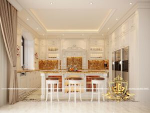 Khám phá phòng bếp gỗ óc chó tân cổ điển tại biệt thự Vinhomes Riverside.