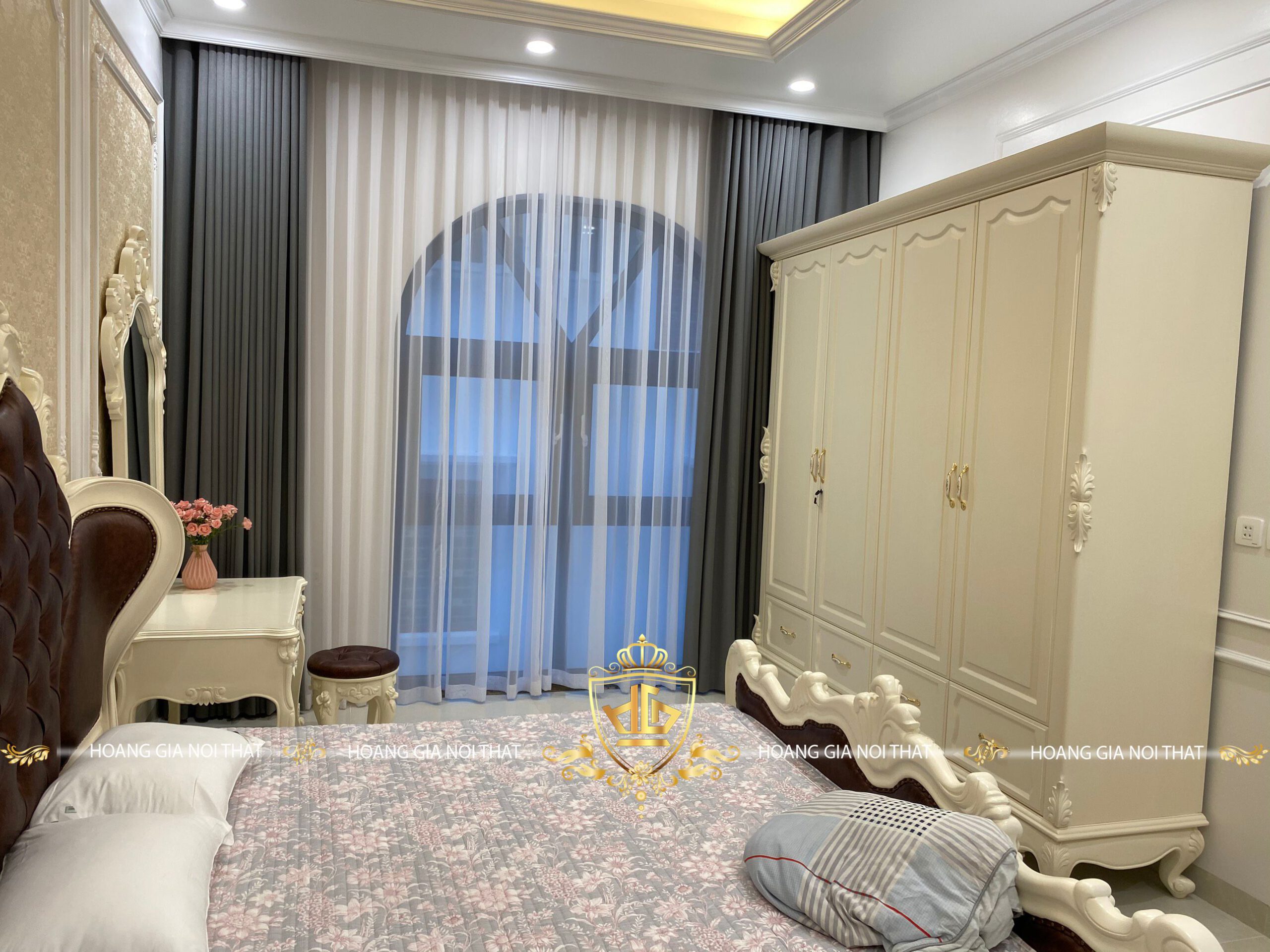 Mỗi món đồ nội thất, từ giường ngủ, tủ quần áo đến bàn trang điểm, đều được bố trí tối ưu, vừa đảm bảo tính thẩm mỹ vừa tiện lợi trong sử dụng.