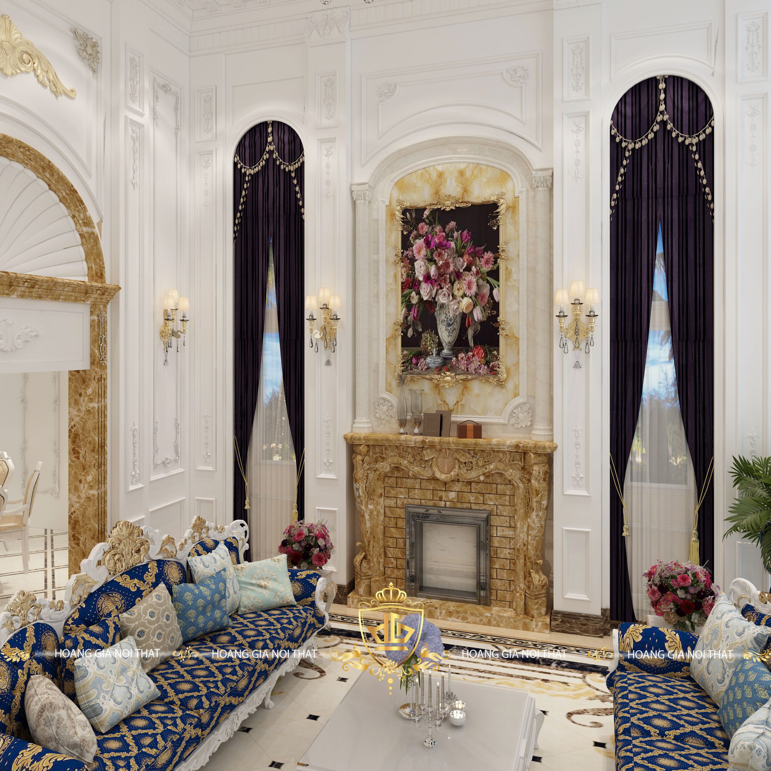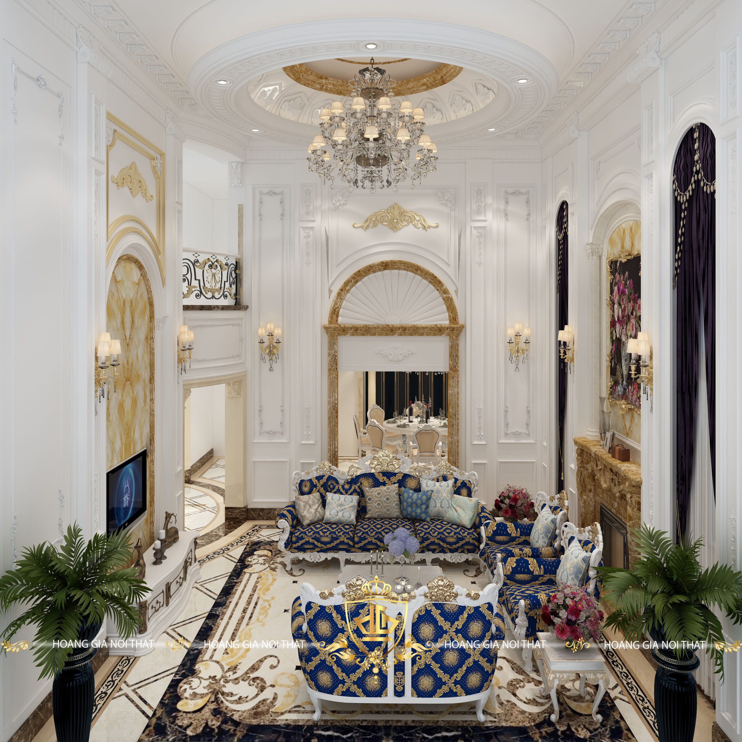 Phòng khách của biệt thự chị Mai là một tác phẩm nghệ thuật, với những món đồ nội thất được chọn lọc kỹ càng từ gỗ óc chó. Bộ ghế sofa tân cổ điển với thiết kế đường cong mềm mại và lớp bọc vải cao cấp mang lại sự thoải mái và sang trọng. Bàn trà gỗ óc chó được gia công tỉ mỉ với mặt đá hoa cương sang trọng, nổi bật với những đường vân gỗ đẹp mắt.