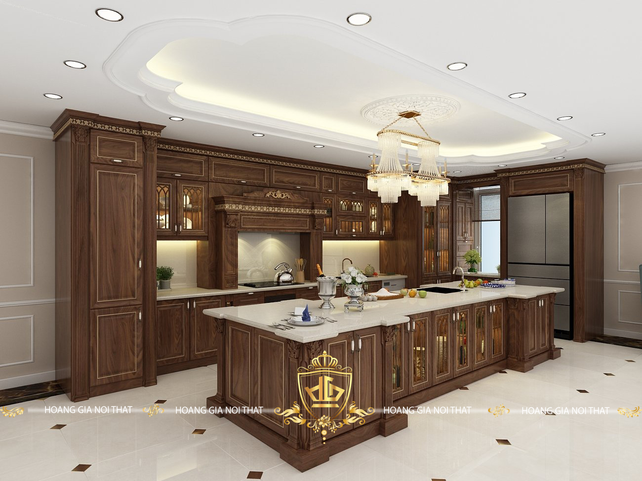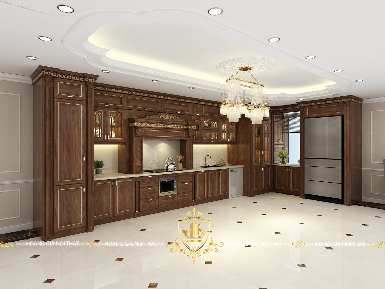 Phòng bếp trong biệt thự của chị Mai là một không gian lý tưởng cho những người yêu thích nấu nướng và tận hưởng bữa ăn trong một không gian sang trọng. Tủ bếp gỗ óc chó được thiết kế tỉ mỉ với các đường nét rõ ràng, chắc chắn. Với chất liệu gỗ óc chó cao cấp, phòng bếp không chỉ bền bỉ mà còn mang lại vẻ đẹp tự nhiên, hài hòa.